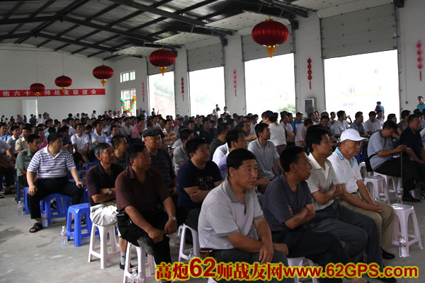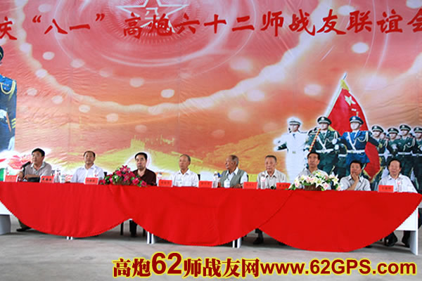 在高炮六十二师建师六十周年来临之际,为了弘扬部队光荣传统,密切战友情谊,交流创业致富经验,我们于七月三十一日在铁岭市官台工业园区举办了盛况空前的庆“八一”高炮六十二师战友联谊会。这次大会主办人为辽宁岩砂晶建材有限公司董事长黄海滨,协办单位为高炮六十二师战友网筹建委员会。参加这次大会的有沈阳、抚顺、铁岭、鞍山、本溪、丹东、哈尔滨、佳木斯、大庆、牡丹江、鸡西以及北京、广西桂林等全国各地的老首长、老战友共三百多人。出席大会的师、旅及厅级以上领导有年近九旬的袁守范老师长、年近八旬的刘文仁政委、年近七旬的师政治部主任、高炮旅政委、军区直工部部长申智贤、军区兵种部部长韩成阳、沈阳预备役高炮师副师长、沈阳军分区副司令员王隆明、高炮旅旅长杨秉臣、四十军高炮旅旅长宋玉文、黑龙江预备役高炮师参谋长孙继宽,以及李成福、王之毅、金振俭三位厅级领导。总后勤部卫生部副部长袁永林、军区联勤部卫生部部长周菊林两位少将也光临了这次大会。师、旅机关、医院及各团的部分领导和老同志参加了这次大会。