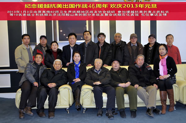2013年1月3日上午,原高炮62师卫生界抚顺地区战友协会在抚顺石化宾馆组织“纪念援越抗美出国作战46周年,喜迎2013新年联谊活动”。曾参加援越抗美的老战士高占武、亢浚、张锡德、杨占升、周心乐、马维山、李锡儒、郭秀华、张福双、王军年、龙有才应邀赴会,专程从北京、沈阳、鞍山赶来及在抚顺的部分老同志袁永林、周菊林、刘长河、李学东、孟宪法、陈长岱、林戈、董洁等8人怀着崇敬之情也参加了联谊活动。1967年1月,高炮62师肩负着祖国的重托,分别从丹东、西宁奔赴越南,参加援越抗美的伟大斗争。46年过去,当年的年轻人今天已是七八十岁的老人,但作为这场战争的亲历者,他们对残酷战场的环境,对每一次激烈的战斗、每一次生死的离别仍历历在目,对牺牲的战友仍深深的怀念。越南作战七个多月,虽在人生里程中很短暂,然而,却是一生中最光辉灿烂的一页。我们祝愿这些为祖国赢得荣誉,为世界和平作出贡献的老同志健康长寿,我们要把他们的国际主义精神,不怕牺牲的奉献精神发扬光大,为中华民族伟大复兴而奋斗。